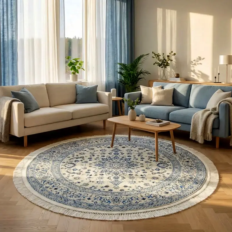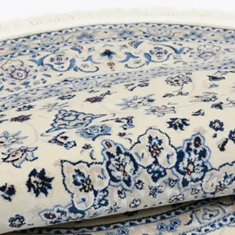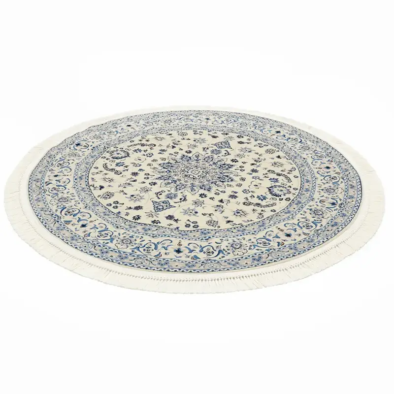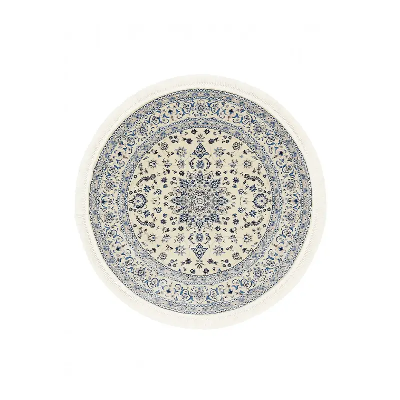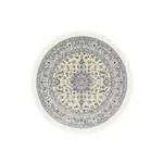 Oppdag den tidløse skjønnheten til Nain Emilia, et vakkert rundt teppe som forener tradisjonelt persisk-inspirert design med moderne slitestyrke. Med en diameter på 150 cm er dette teppet ideelt for å skape et harmonisk midtpunkt i stuen, under et rundt bord eller som et elegant innslag i en romslig entré. Fargepaletten i kremhvit og dype blåtoner gir et sofistikert og luftig uttrykk som komplementerer skandinavisk interiør perfekt. Detaljrikdommen i mønsteret reflekterer den klassiske Nain-stilen, kjent for sin eleganse og harmoni. Teppet er laget av materialer som er både myke å gå på og enkle å vedlikeholde, noe som gjør det praktisk for daglig bruk. Nain Emilia er det perfekte valget for deg som ønsker en luksuriøs atmosfære kombinert med god holdbarhet. Tilfør hjemmet ditt en følelse av klasse med dette stilrene dekorasjonselementet som aldri går av moten.